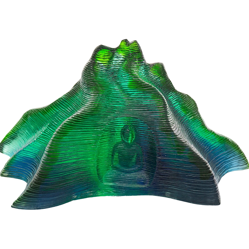 Kristallilasin läpinäkyvyys, värigradientit sekä valon ja varjon vuorovaikutus toimivat "Zen-mediana", joka yhdistää menneisyyden ja nykyisyyden. Gradientti vehreästä syvän siniseen ammentaa inspiraatiota Anyue-vuoren rehevistä metsistä ja rauhallisesta hämärästä ja resonoi perinteisen kiinalaisen "sinivihreän maisemamaalauksen" kanssa – luolatemppelin yhdistäessä taivaan ja maan rytmeihin luonnon sävyillä. Kun valo tunkeutuu kerrostettuun lasiin, sävyt sekoittuvat ja illuusiot kietoutuvat yhteen herättäen luolia ympäröivän aamunkoiton sumuisen säteilyn. Lasin "tyhjyyden" (läpinäkyvä laatu) ja "värin" (kylmät vihreät-siniset sävyt) dialektinen rinnakkaiselo tulkitsee buddhalaisuuden äärimmäistä filosofista näkemystä: "tyhjyys on muotoa, muoto on tyhjyyttä". veistos "hetkellä, joka on ikuisuus" - tuo esiin syvän rauhallisuuden, jonka tuuli ja sade on tislaanut Anyuen kivikaiverruksiin.