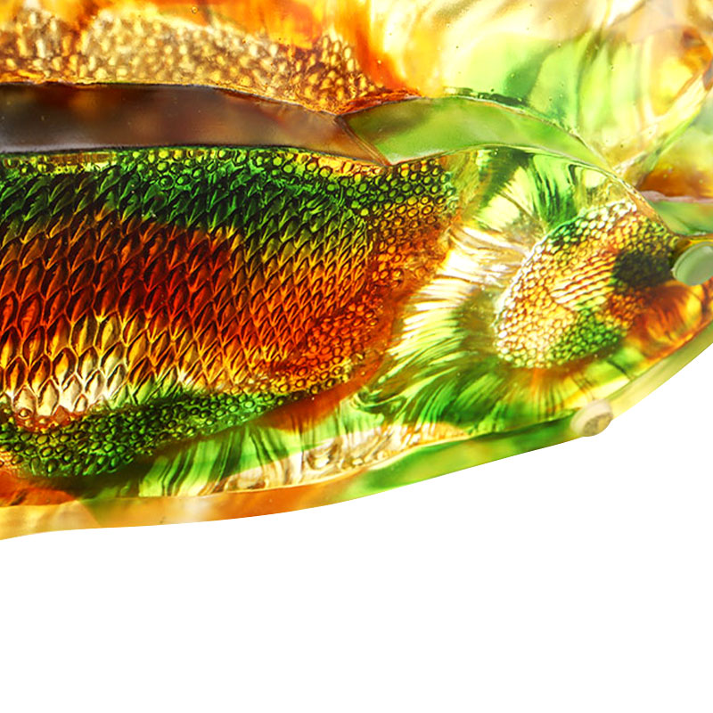 Värillinen lasite aurinkoon päin oleva levy näyttää tiivistyneen auringonvalon vaikutuksesta. Jokainen lautasen viiva on kuin auringonvalon jättämät jalanjäljet ​​terälehdille, jotka loistavat kultaisella valolla. Hieno ammattitaito tekee auringonkukkien elinvoimasta ja elinvoimasta ikuisesti kiinni värilliseen lasitteeseen. Lautasen punaiset hedelmät ovat yhtä kirkkaita kuin liekit, lisäten ripauksen eloisaa väriä tähän upeaan aurinkoon päin olevaan lautaseen. Se ei ole vain taideteos, vaan myös toivottava yhdistelmä auringonvaloa ja elämää. Se voi säteillä lämpöä ja iloa, kun se asetetaan sinne hiljaa.