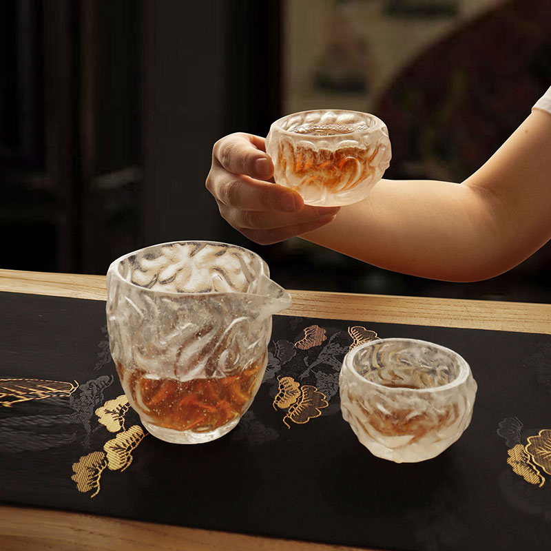 Tämä Spark Fireworks -sarjan läpinäkyvä teesettisarja on yksinkertaisesti taideteos! Kristallinkirkas materiaali tuntuu jäädyttävän ilotulitteiden kukinnan hetken, ja jokainen jään palanut kuvio on kuin luonnon piirtämä kuvio, ainutlaatuinen ja runollinen. Messukupin ja pienen kupin koko on hyvin suunniteltu, ei vain käytännöllinen, vaan myös kuin sarja upeita veistoksia lisättynä työpöydälle. Ne ovat jalompia ja elegantimpia tummaa puupohjaa vasten, ikään kuin kertoisivat hiljaa rauhallisesta ja kauniista elämäntyylistä. Käytetäänpä sitä teen maistelua tai koristeena, se voi tuoda ihmisille kaksinkertaisen näön ja sielun nautinnon. Se on todella nerokas ja kaunis.